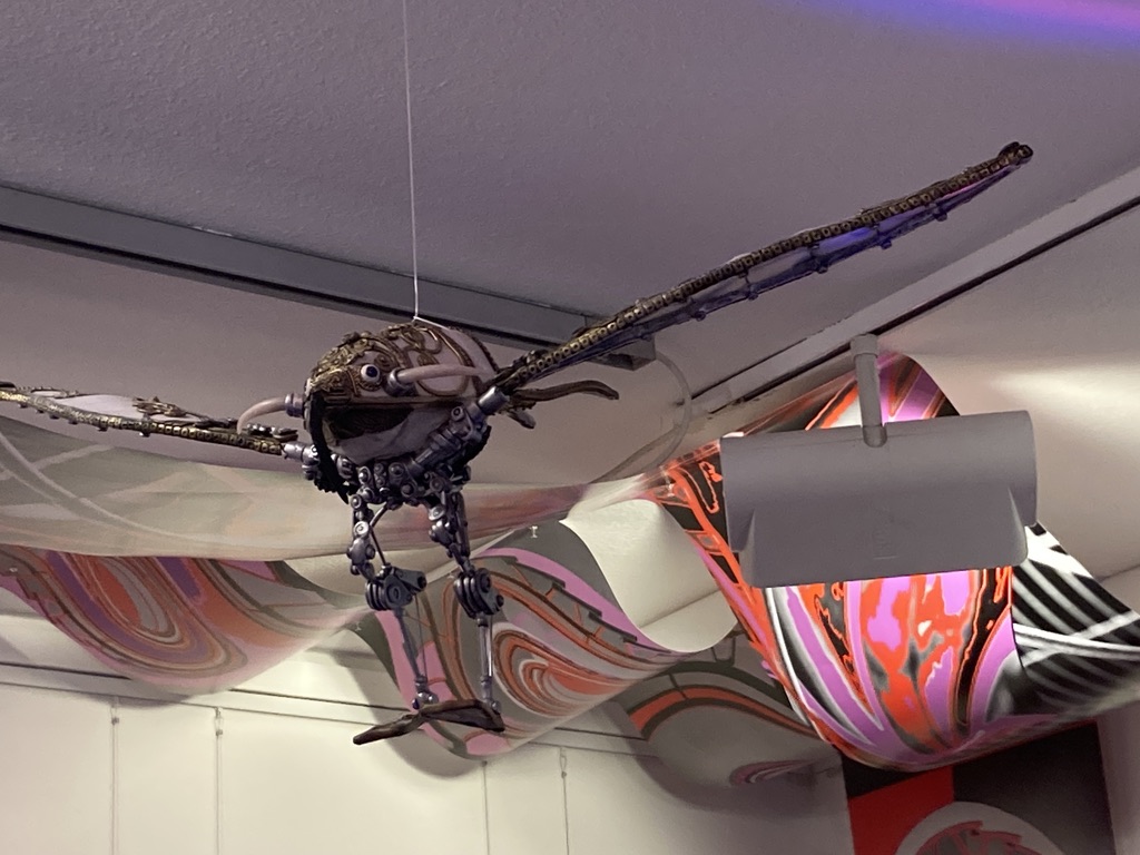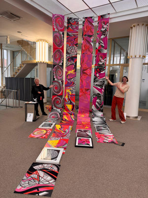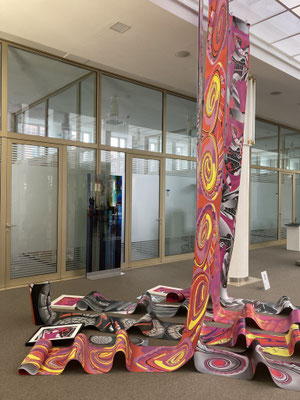 Alles steht mit allem in Verbindung! Lange, in den Raum hineinfließende Bilder-Bahnen breiten sich aus. Jede Bahn nimmt eine andere Entwicklung, keine gleicht der anderen.
