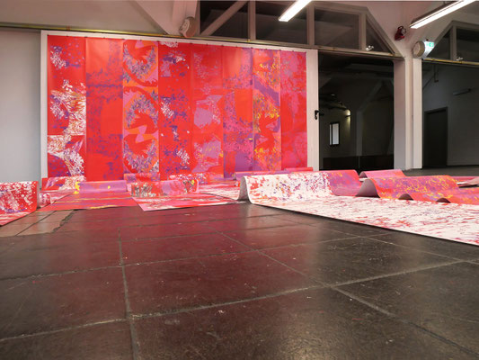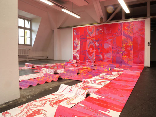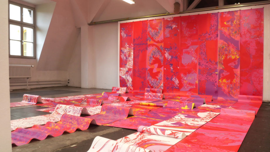 Alles steht mit allem in Verbindung! Lange, in den Raum hineinfließende Bilder-Bahnen breiten sich aus. Jede Bahn nimmt eine andere Entwicklung, keine gleicht der anderen.